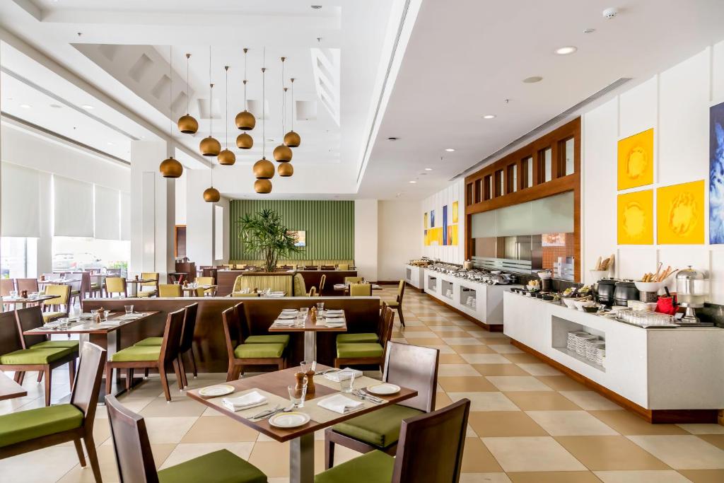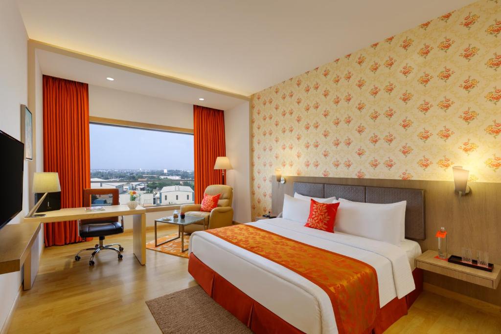The hotel's location is near SRM University and SRM Nagar, which are 4.9 km away, while Maraimalai Nagar is 9 km away, and Oragadam is 19 km away. The Tambaram Railway Station is 5.9 km away, and the Chennai International Airport is 14.4 km away.