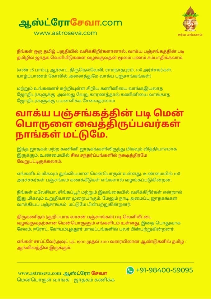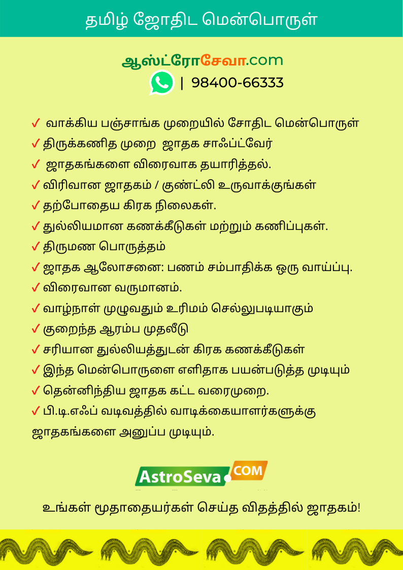 Keywords: திருக்கணிதமுறை astrologysoftware indianastrology astrologysoftwareforlaptop AstroSeva.Com kundlisoftware astrologysoftwareforpc தமிழ்மென்பொருள். horoscopesoftware வாக்கியமுறை astrologysoftwareforvakyam தமிழ்ஜாதகம் ஜோதிடமென்பொருள் Stardotstar
