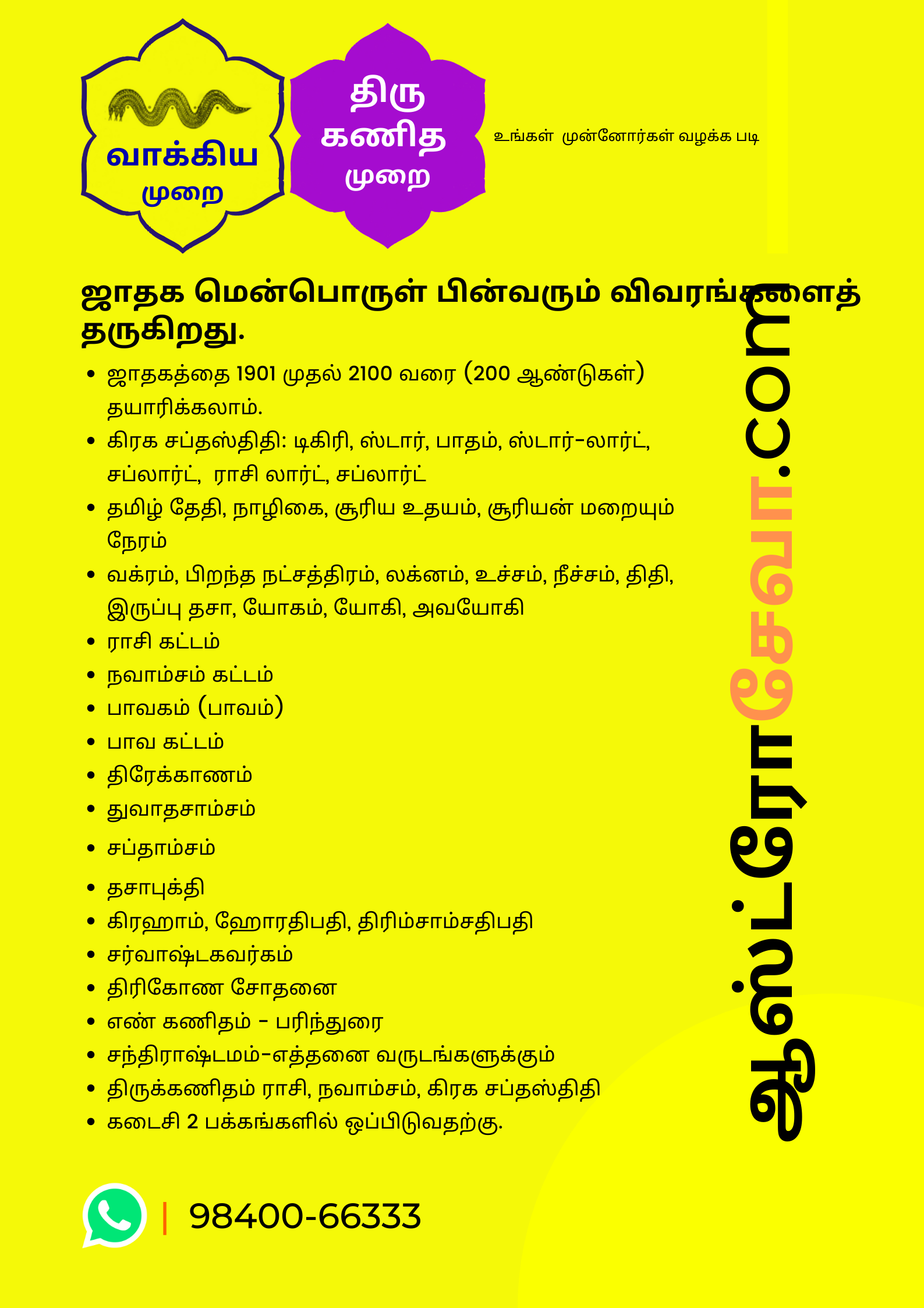 AstroSeva.Com சுத்த வாக்கிய மற்றும் , திருக்கணித முறை தமிழ் ஜாதகம் ஜோதிட மென்பொருள் கிடைக்கிறது.