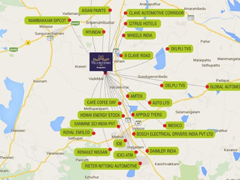 Near Vallakottai Murugan Temple 100% Vastu compliant layout design Underground Sewage, Power and Storm water Lines Avenue Plantation Natural Lake adjoining the property. Airport: Chennai International Airport 37 Kms Railway Station: ingapperumal Kovil Railway Station 19 Kms Hospital: Jaya Hospital 1 Kms City Center: Guindy 46 Kms School: PS Secondary School 1 Kms