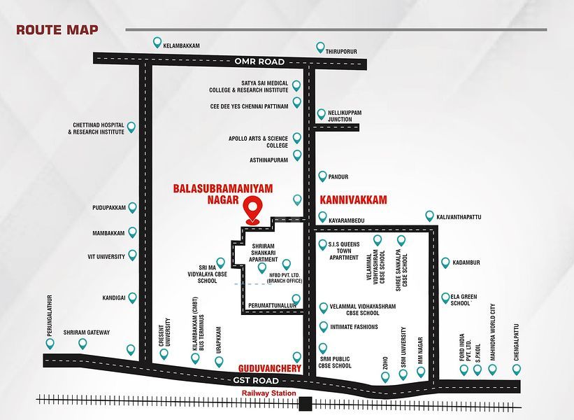 Balasubramaniyam Nagar is a residential project located in Guduvanchery, This residential project comprises of Villas And Plots with modern decor as well as basic amenities. The area is also well connected to major schools and colleges.