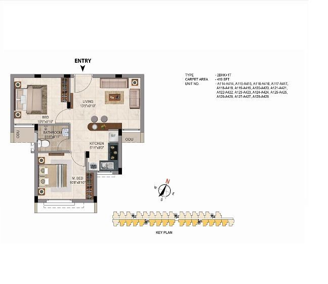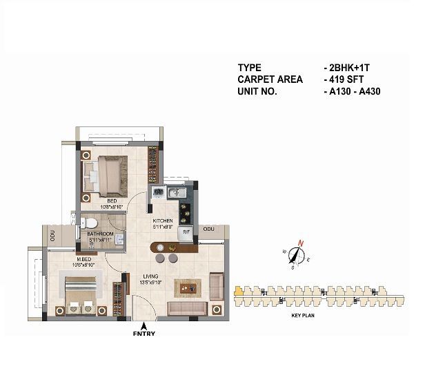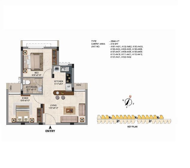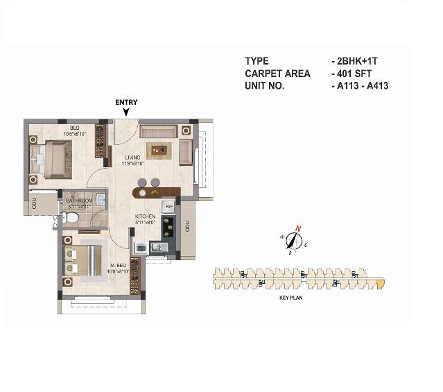 Living, dining, kitchen and bedrooms will have 2 feet X 2 feet vitrified tiles