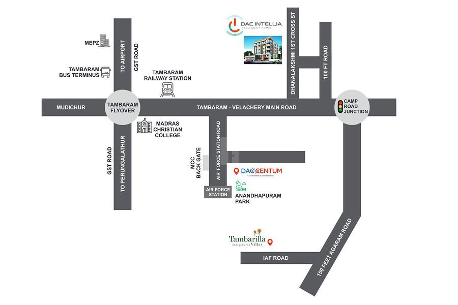 Interllia is a strategically located 2&3 BHK Boutique Apartments in east Tambaram. One can reach Tambaram railway station in just 5 mins and it is 2 mins from Camp road junction. DAC Intellia is placed midway and is accessible to all prominent locations in and around Tambaram