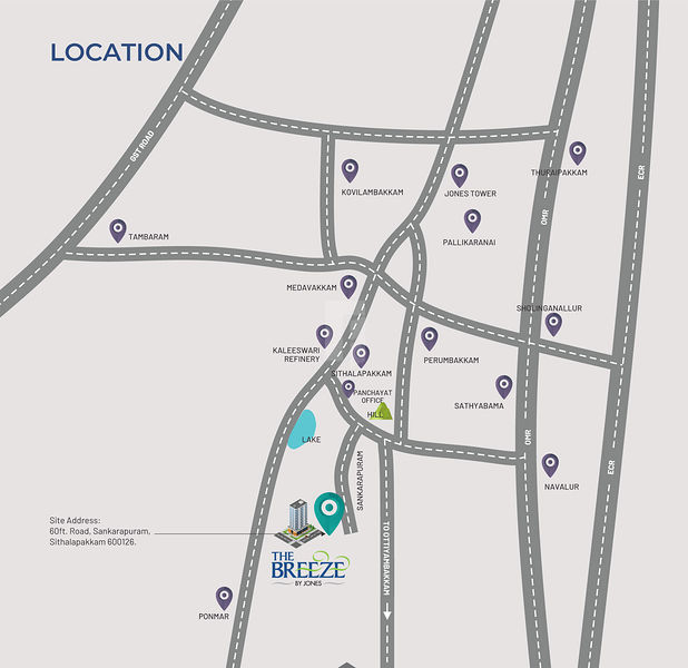Jones The Breeze, consisting of 2 and 3 BHK Apartments, is developed on a 2-acres land with sprawling greenery and pedestrian-friendly zones, combined with modern Facilities such as a 3-tier security system with 24/7 Security, CCTV Surveillance and Individual security camera and monitor. Situated in the flourishing location of Medavakkam, at Sithalapakkam in Chennai, these apartments offer you the best of gated community so that you live your life the way you have dreamt it.