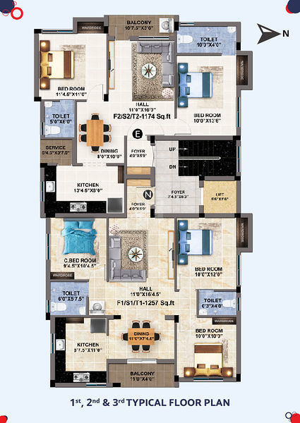 Entire Blocks are provided with 2’x4’ Kajaria/Equivalent brands* tiles and all bathroom will be 1’x1’ Anti Skid tiles