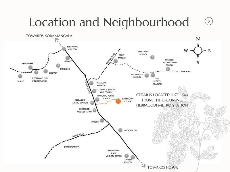 Cedar is located at Kammasandra, Electronic city Phase II and is only 1 Km from the upcoming Hebbagodi Metro Station on Hosur Road. Cedar will have 156 two and three BHK units on 2.25 acres of land